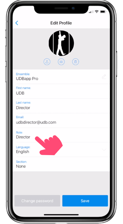 Once you've selected the member who needs a different role assigned from the Ensemble section of your Settings, tap on the role. Tap on the new desired role.