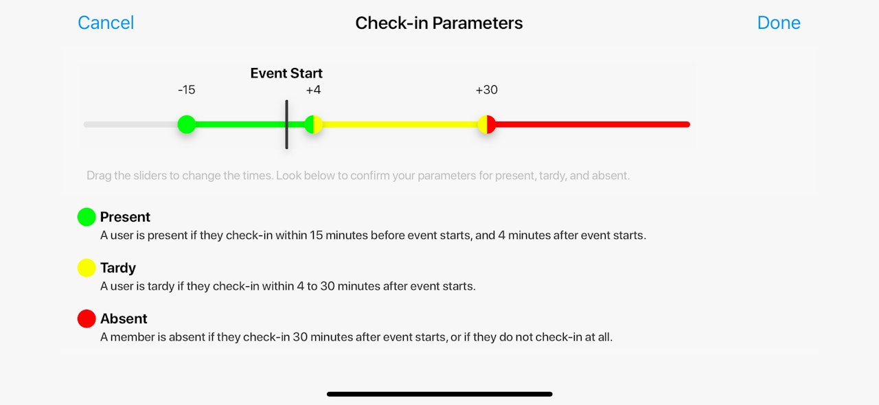 Check-In parameters determine the time frame in which a member will be logged as present, tardy, or absent after checking-in. For instance, if you would like members to not be marked tardy until 5 minutes past the start time or an event, you can move the tardy slider to +5 minutes. These settings are global, so they will apply to all calendar events that attendance is taken.