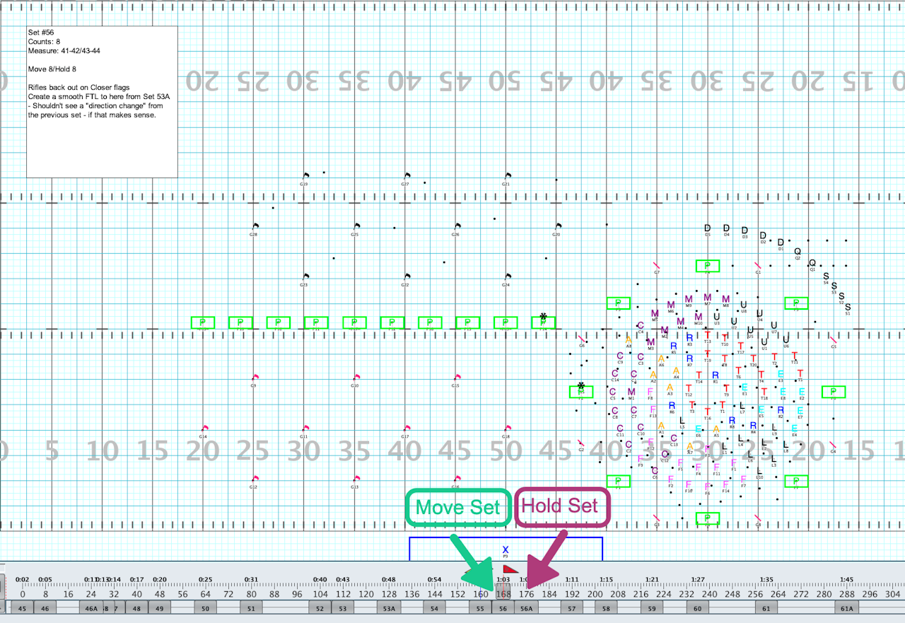 If you have a “move 8, hold 8,” instead of having a 16 count move where you would only have the performers moving for the first 8, instead, add a New Numbered Set Tab after the first 8 counts and a second “Subset Tab” after the second 8 counts to represent the Hold portion, thus breaking the move into “two 8’s.”